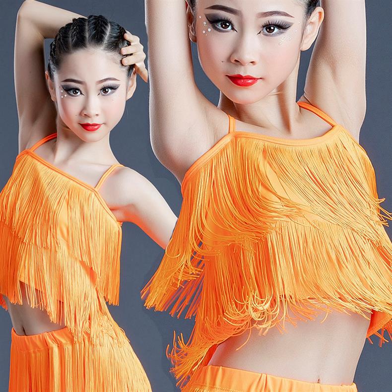 Completo danza bambina a due pezzi in arancio brillante con frange che danzano ad ogni movimento. Top corto con spalline sottili e pantaloni a zampa, realizzati in tessuto elasticizzato leggero per massima libertà di movimento. Design energico e colorato perfetto per esibizioni, saggi e gare. Uno stile travolgente che cattura l'attenzione sul palco!